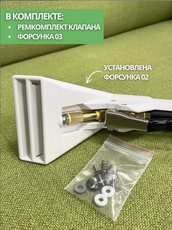 Установлена 02 форсунка, в комплекте запасное стекло, ремкомплект клапана, форсунка 03.